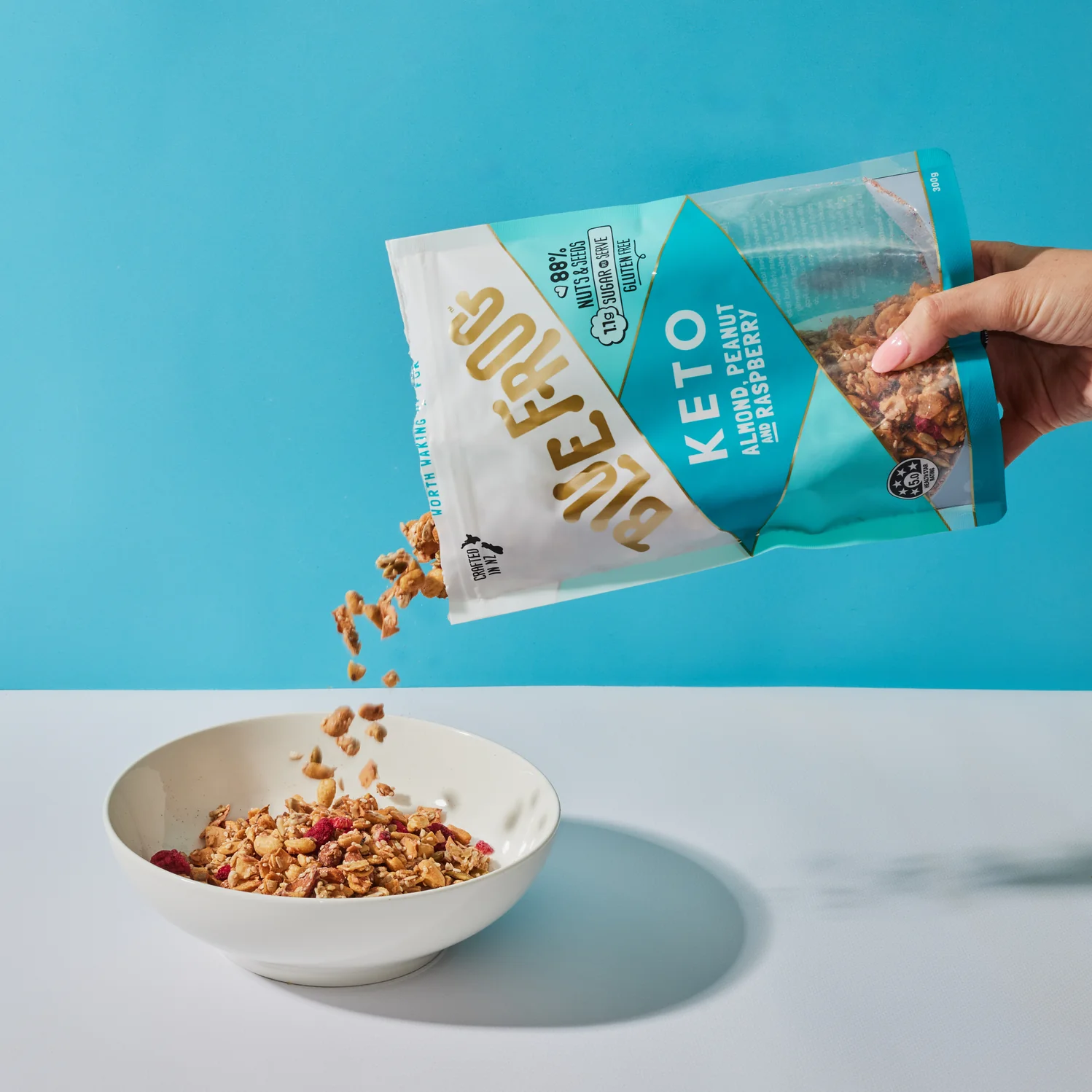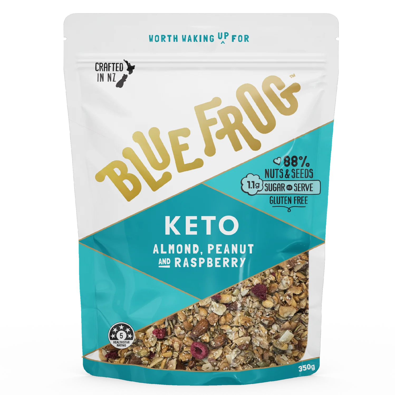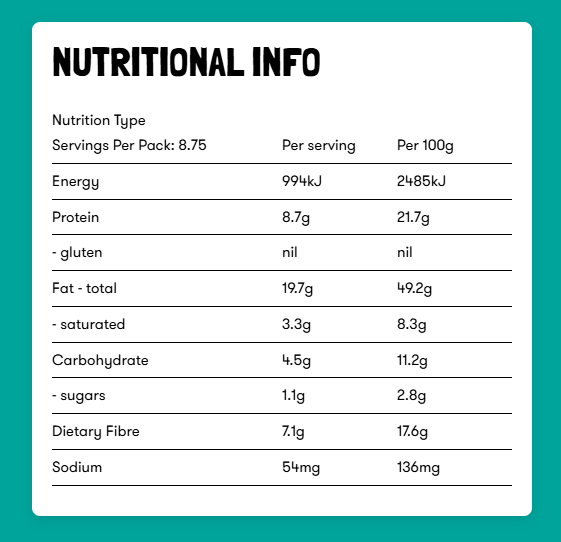 Ingredients: Nuts 53% (Peanuts 27%, Almonds 16%, Coconut), Seeds 35% (Sunflower, Pumpkin, Sesame, Chia), Fibre Rich Tapioca Syrup, Freeze Dried Raspberrys 1%, Natural Vanilla Extract, Monk Fruit, Sea Salt, Natural Antioxidant (Rosemary Extract)