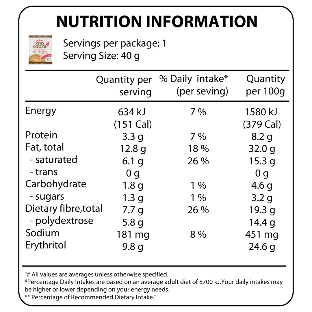 Almonds, Sweetener (Erythritol), Bulking Agent (Polydextrose), Vegetable Oil Spread (Palm Oil & Palm Kernel Oil, Water, Salt, Emulsifiers (471, Soy Lecithin 322, 435), Natural Flavour, Antioxidant (307b), Natural Colour (160a)), No Added Sugar White Compound Choc Chips (14%) (Sweetener (Erythritol), Vegetable Fat (Palm Kernel Oil, Contains Emulsifier (Sorbitan Tristearate))), Soy Protein Isolate, Milk Solids, Emulsifier (Soy Lecithin), Natural Vanilla Flavour)), Dessicated Coconut, Coconut Flour, Flavour, Emulsifier (Soy Lecithin), Sea Salt, Baking Powder (Contains Raising Agents (Sodium Acid Pyrophosphate, Sodium Bicarbonate)).